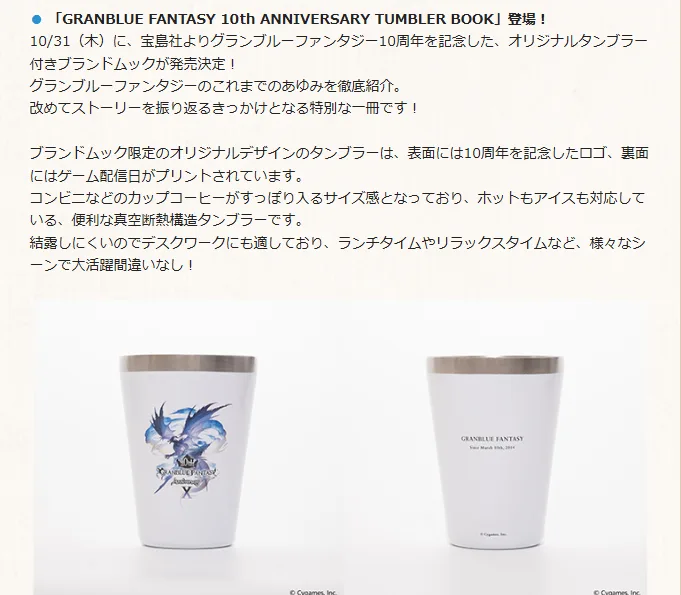 10/31(木)に、宝島社よりグランブルーファンタジー10周年を記念した、オリジナルタンブラー付きブランドムックが発売決定!