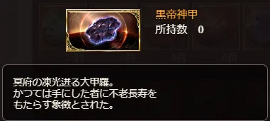 黒帝神甲は、主にネプチューンや四象瑞神でドロップしますが、四象瑞神でドロップ対象のときと対象じゃない時があるのでイベント開催時確認しておきましょう。ドロップ率は低めですが下位素材の監兵真爪も落ちるので必要数集めるのはそう難しくはありません。下位素材の執明真甲を10個で黒帝神甲1個と交換できます。