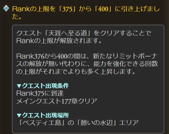 ランクキャップ400解放クエスト「天涯へ至る道」の概要