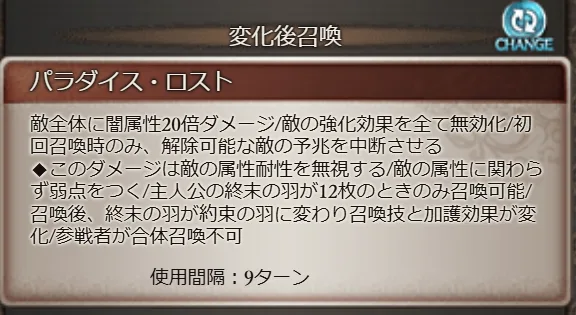 ◆このダメージは敵の属性耐性を無視する/敵の属性に関わらず弱点をつく/主人公の終末の羽が12枚のときのみ召喚可能/召喚後、終末の羽が約束の羽に変わり召喚技と加護効果が変化/参戦者が合体召喚不可