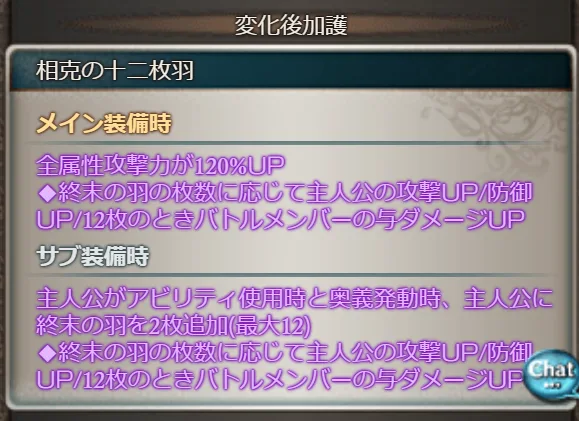 ◆終末の羽の枚数に応じて主人公の攻撃UP/防御UP/12枚のときバトルメンバーの与ダメージUP(効果量は同じ)