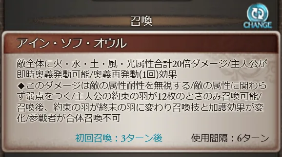 ◆このダメージは敵の属性耐性を無視する/敵の属性に関わらず弱点をつく/主人公の約束の羽が12枚のときのみ召喚可能/召喚後、約束の羽が終末の羽に変わり召喚技と加護効果が変化/参戦者が合体召喚不可