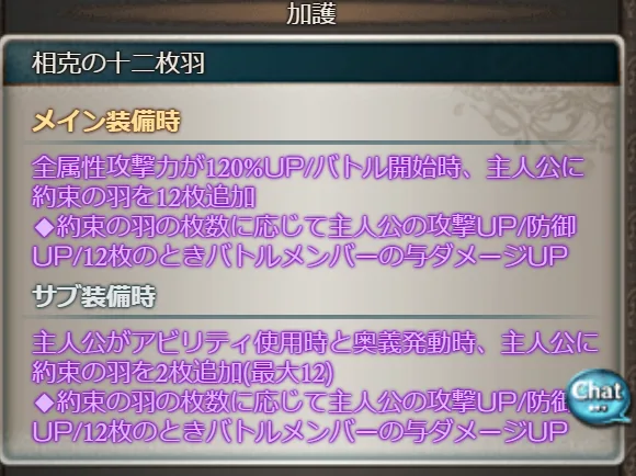 全属性攻撃力が120%UP/バトル開始時、主人公に約束の羽を12枚追加