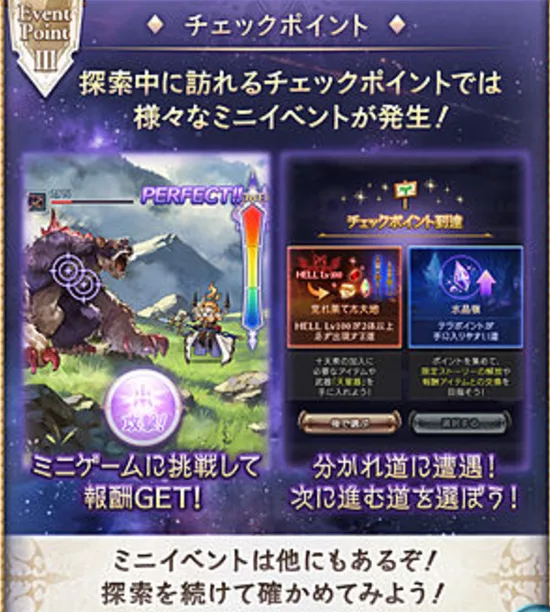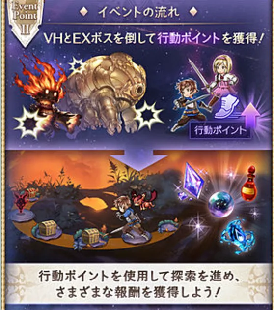 行動ポイントを消費して探索すすめましょう。道中ミニイベントが発生したり、難易度HELLの強敵が出現します。難易度HELLの強敵は天星器や極星器を落とす可能性があるので必ず倒すように心がけましょう。