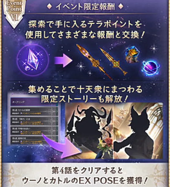 テラポイントを集めることで様々な報酬をゲットできます。さらに十天衆限定ストーリー解放でき、第4話まで解放できればEX POSEの入手が可能となります。