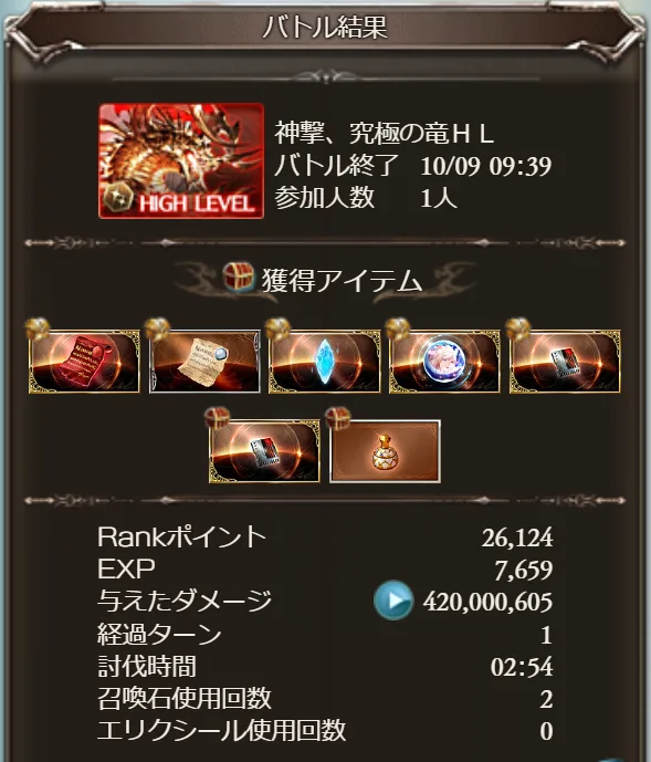 1ターンで発生する総ダメージは非常に高く、フルオートで討伐するのに比べて、短時間での周回が可能になります。下記画像でゆっくり操作しても2分台。なれればもっと時間短縮できると思います。これにより、日課としてのアルバハHL討伐が非常にスムーズになります。